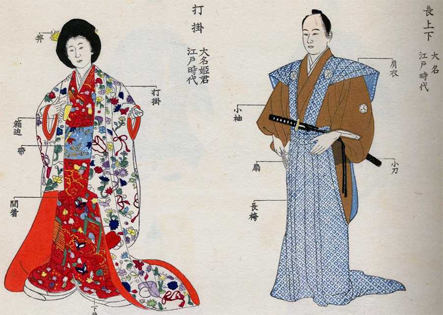 В период Эдо у самураев популярной стала свободная, до бедра накидка «хаори» в сочетании с «хакама» длиной до щиколотки. На «хаори» наносились родовые гербы самураев — на спину, рукава и грудь. Этот набор практически без изменений сохранился до середины XIX века как типичная одежда обеспеченных людей.