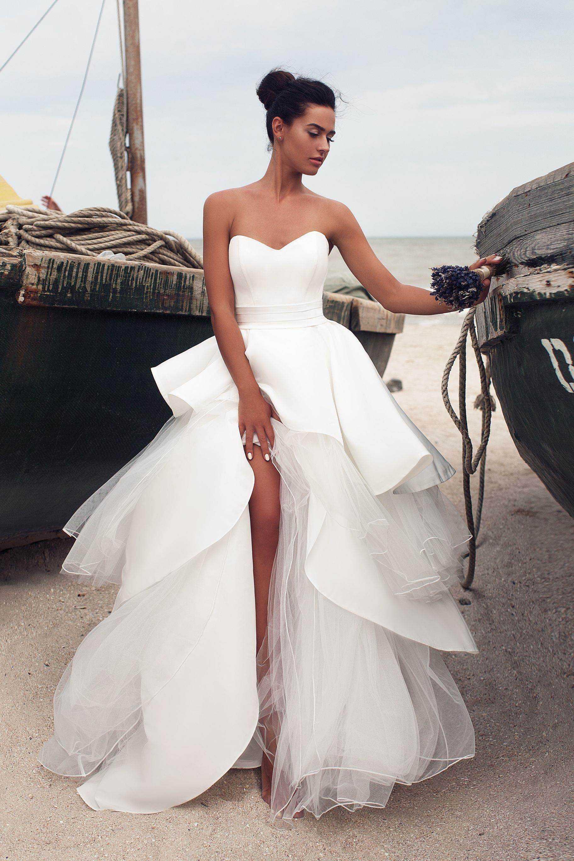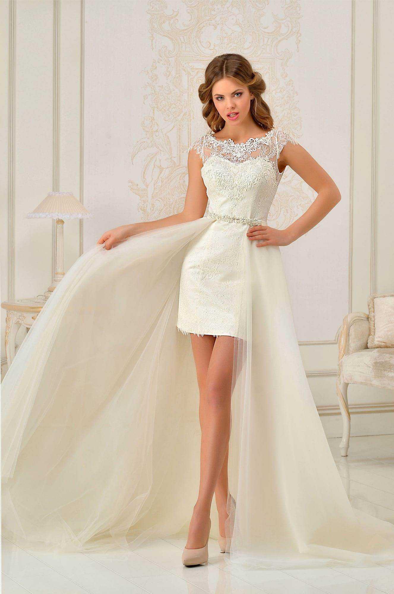 Короткое платье на невесте смотрится достаточно оригинально, позволяя ей в очередной раз продемонстрировать свои красивые ножки. В основном преобладают платья с юбкой, укороченной спереди и плавно удлиняющейся к спине.