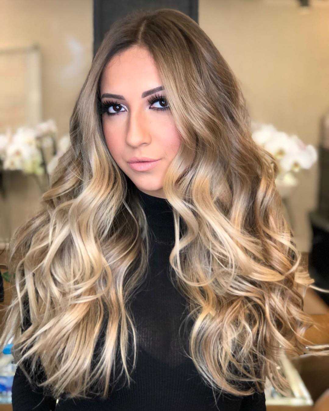 Для градиента используют 2–3 оттенка. При этом границы между ними не обязательно должны быть плавными, незаметными. Вариант с резкими линиями переходов при окрашивании балаяж на длинные волосы тоже существует.