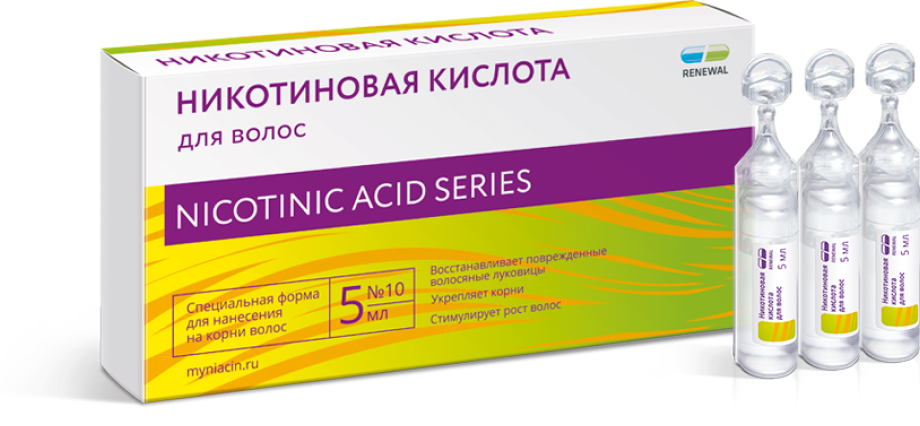 Оптимальную концентрацию этого витамина можно получить при использовании никотиновой кислоты для волос Renewal. Это средство наносится на кожу головы, тем самым стимулируя кровообращение и обмен полезных элементов. Все это дает возможность укрепить фолликул и не предупредить преждевременно выпадение волос.