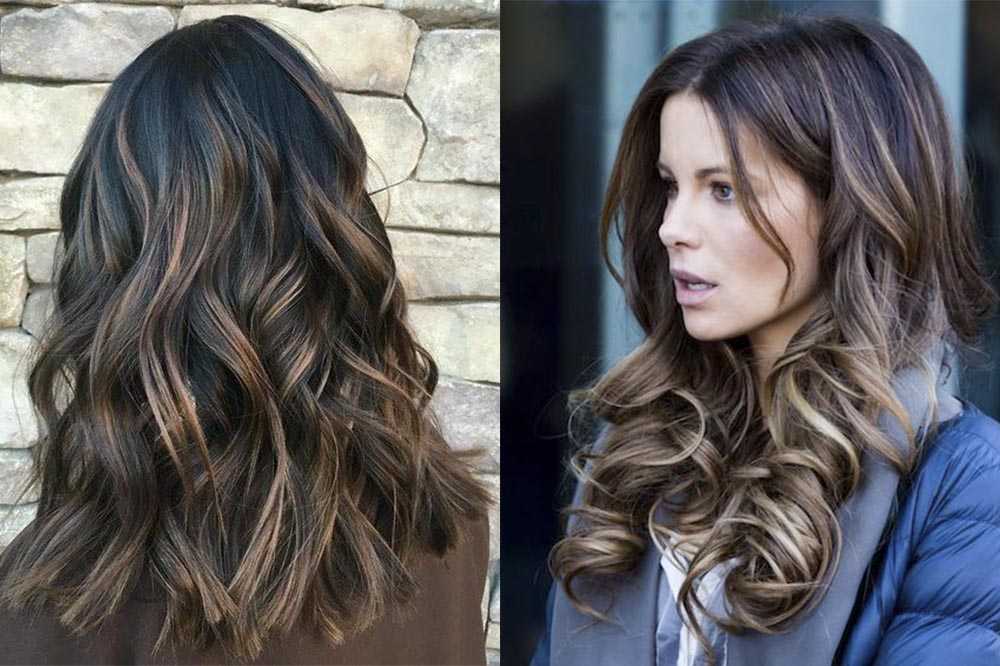 Балаяж. Вертикальная покраска будет выигрышно смотреться на темно-русых локонах. Покраска несколькими тонами дает игру тонов и очень красива. Используются медовые, рыжеватые, кофейные, шоколадные и каштановые цвета.