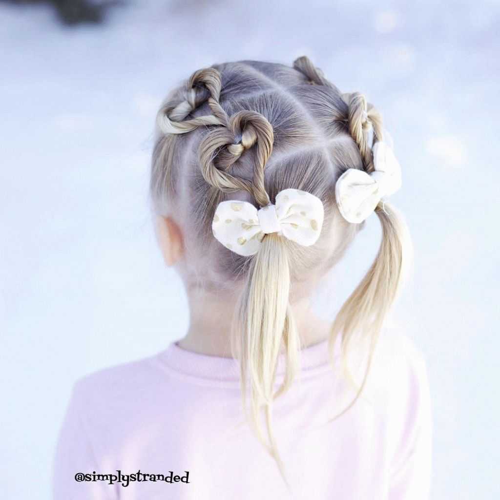 Дети любят забавные причёски, особенно те, которые напоминают по форме сердечко. Разделите волосы на пробор, и каждую сторону ещё на 3 квадратные секции. Скрутите из волос жгутики и сформируйте из них сердечки. Концы волос завяжите в хвостики с бантиками.