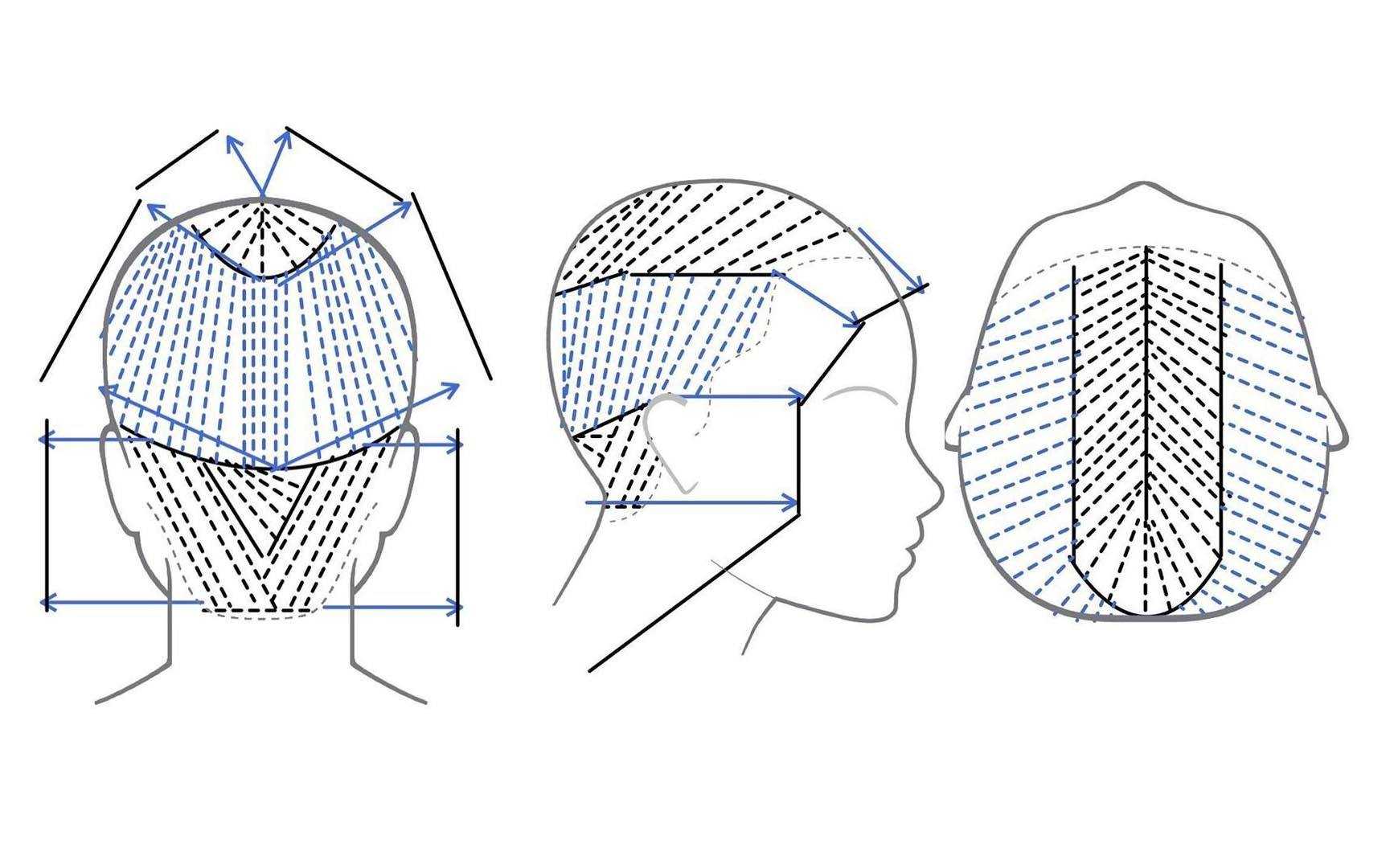 - Увлажненные, тщательно расчесанные волосы разграничивают по зонам. Центральным вертикальным пробором шевелюру делят пополам. Горизонтальным пробором, проходящим между ушей по макушке, отделяют затылок и теменную часть.